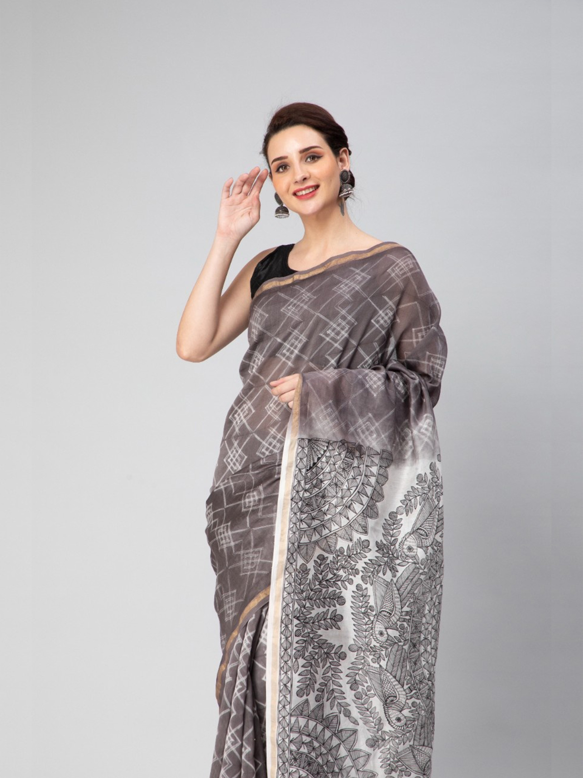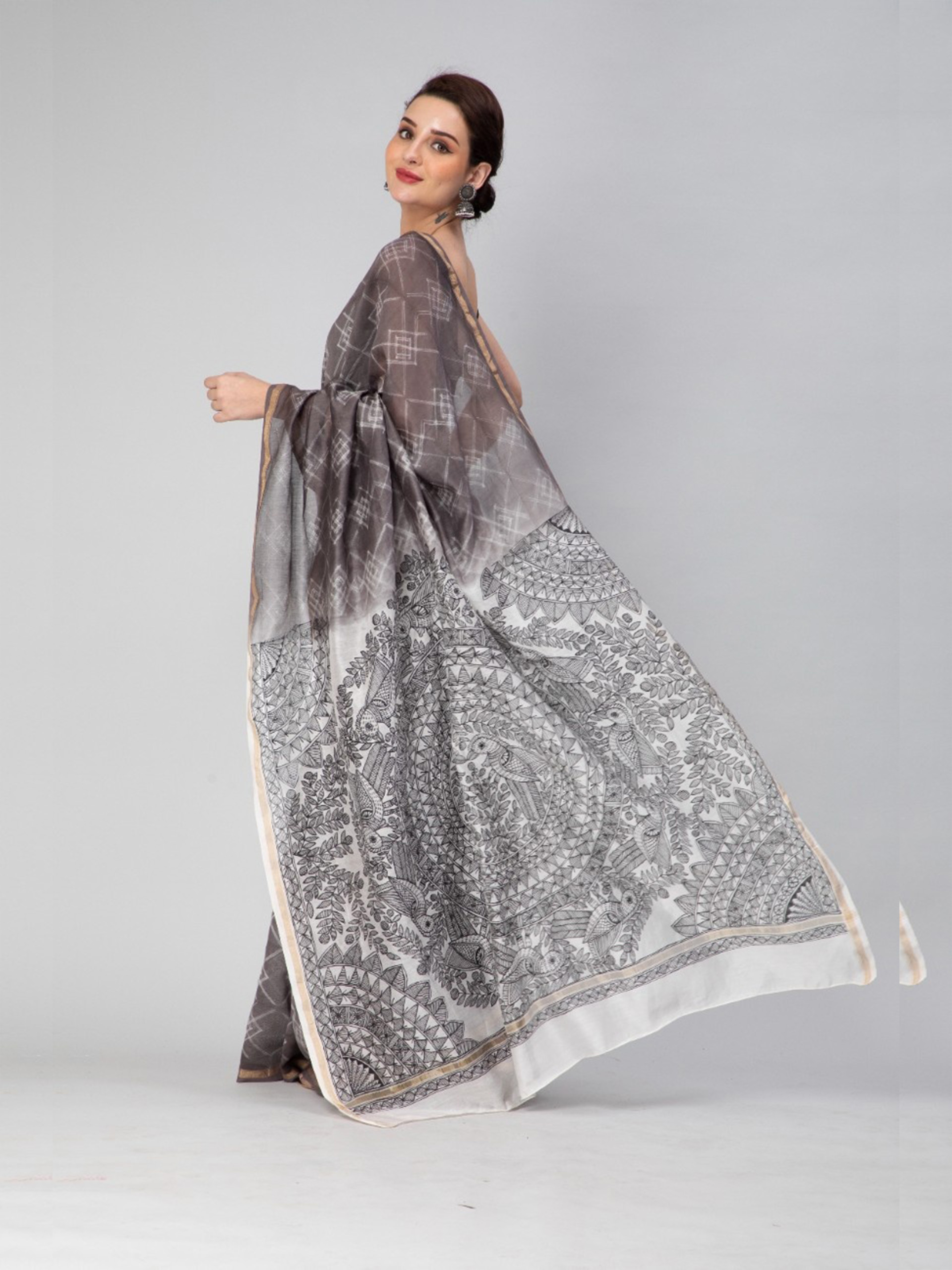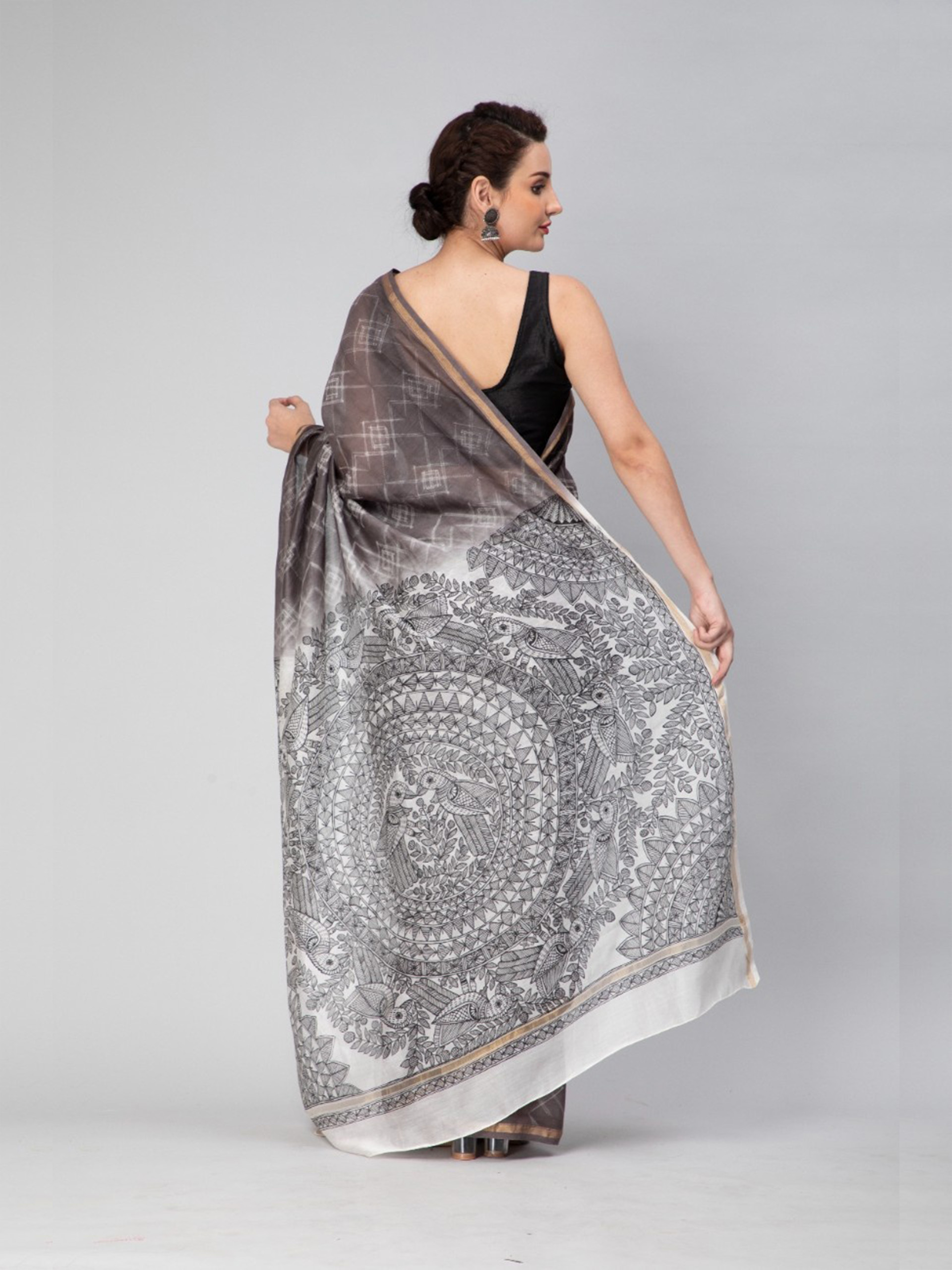The saree beautifully fuses the intricate hand-painted motifs of Madhubani art — inspired by nature, mythology, and folk tales — with the fluid patterns of Shibori, a traditional tie-dye technique that adds depth and modern appeal. The black base enhances the vibrant Madhubani motifs, creating a striking balance between bold elegance and cultural artistry.