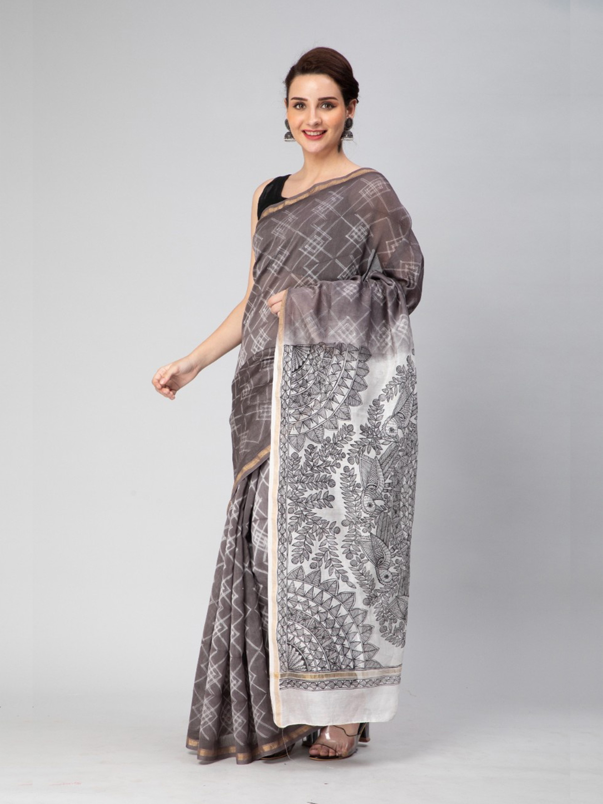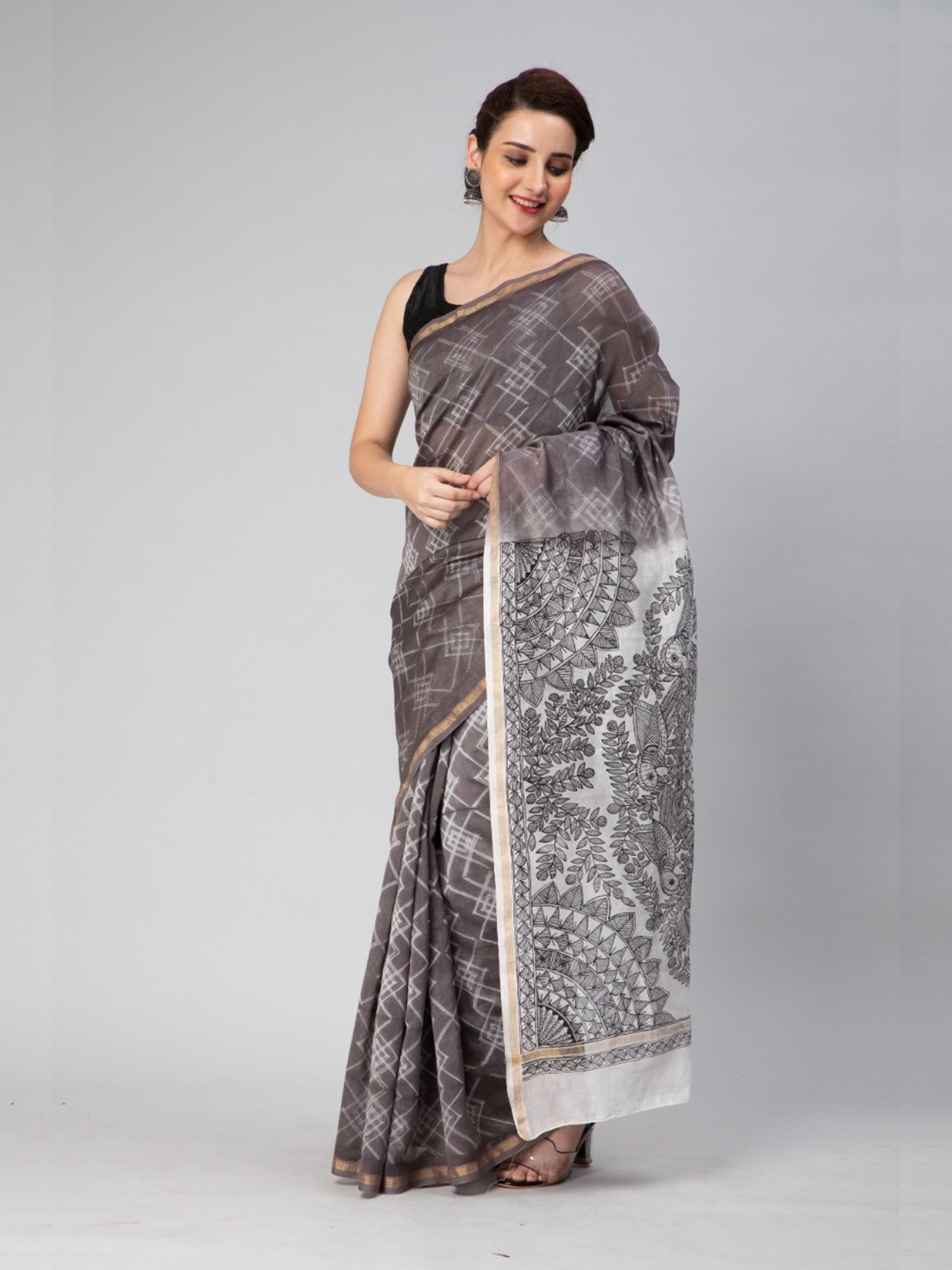 Welcome to Roots Tale! Presenting the Black Madhubani & Shibori Fusion Chanderi Silk Saree — an exquisite blend of tradition, creativity, and craftsmanship.