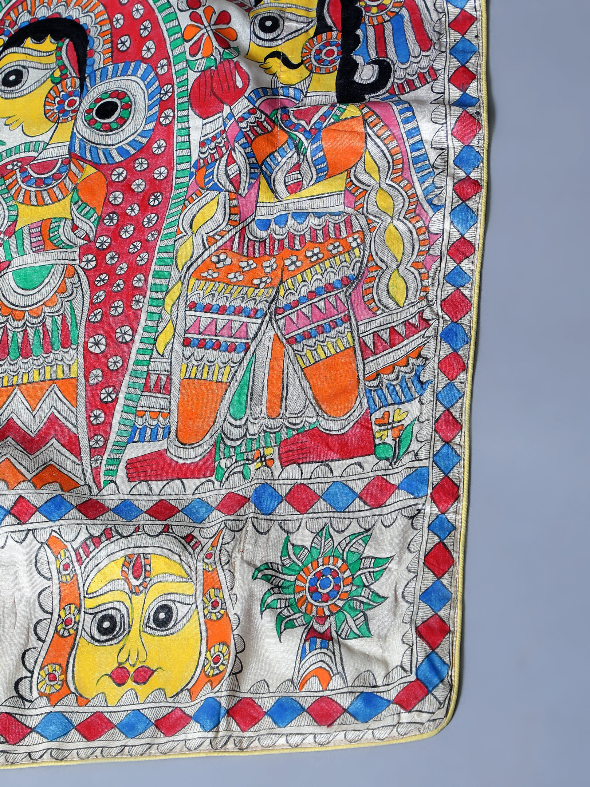 * Design: Hand-painted Ram Vivah scenes in multicolor – each saree unique