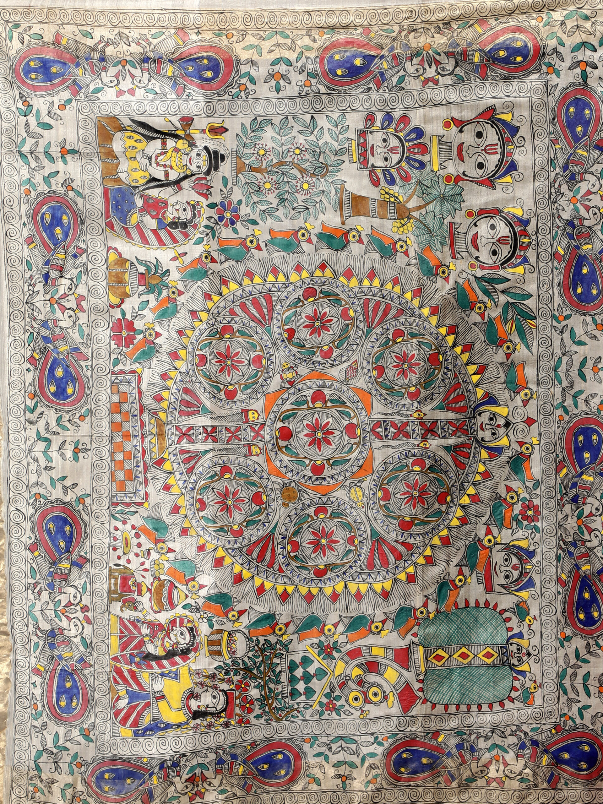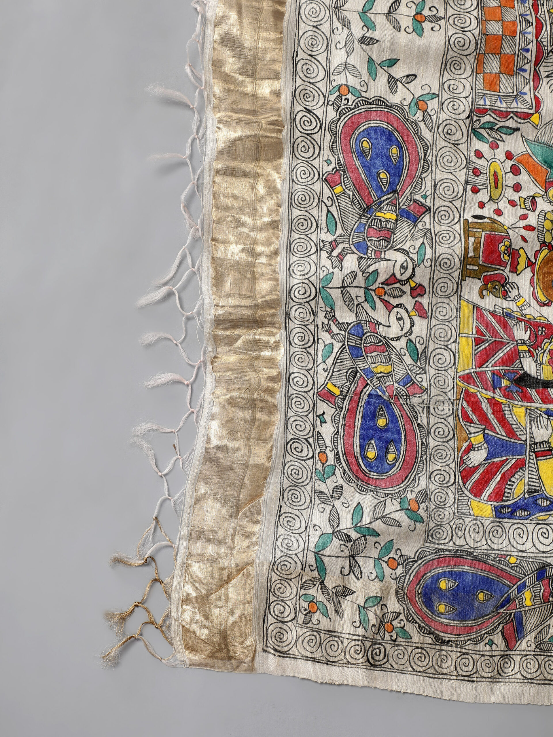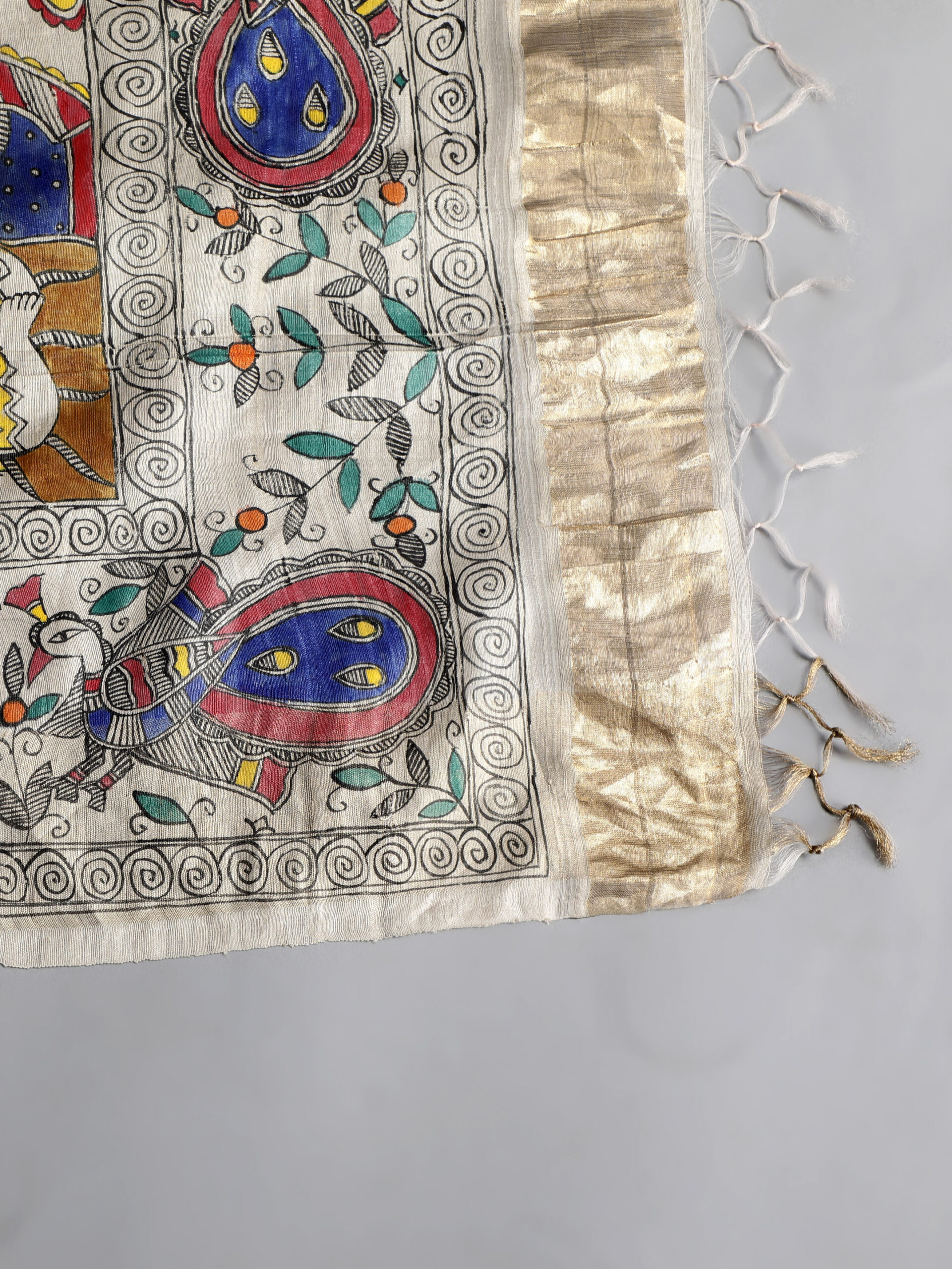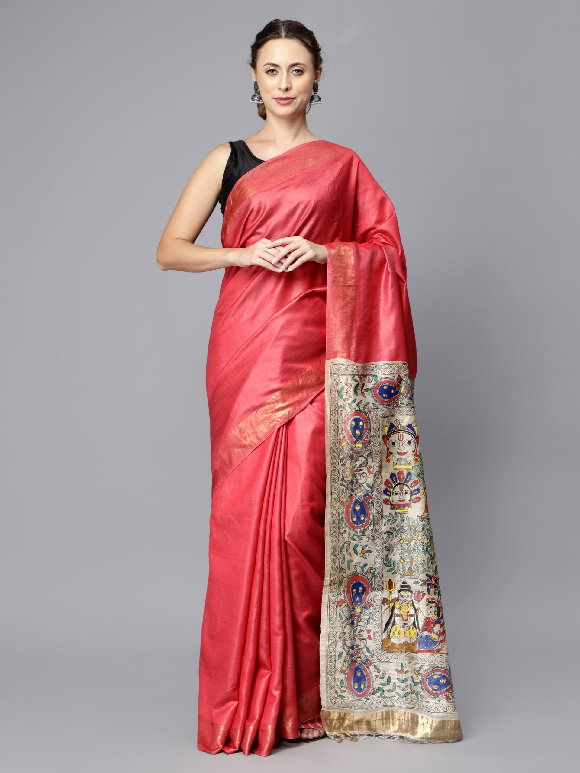 The vibrant red base enhances the intricate hand-painted detailing, making the saree a timeless piece of wearable art. Crafted by skilled artisans of Bihar, it beautifully blends cultural storytelling with elegant drapery.