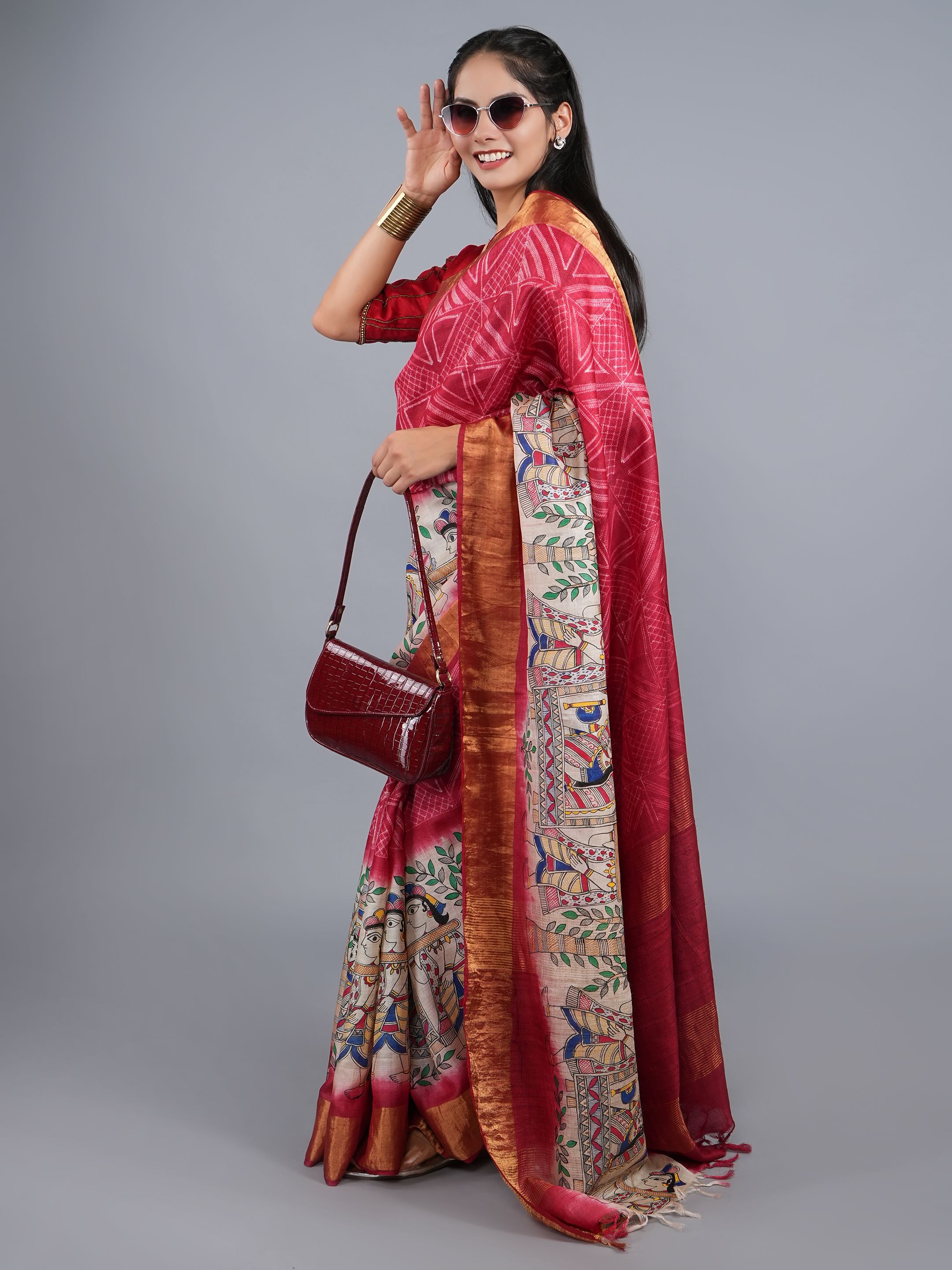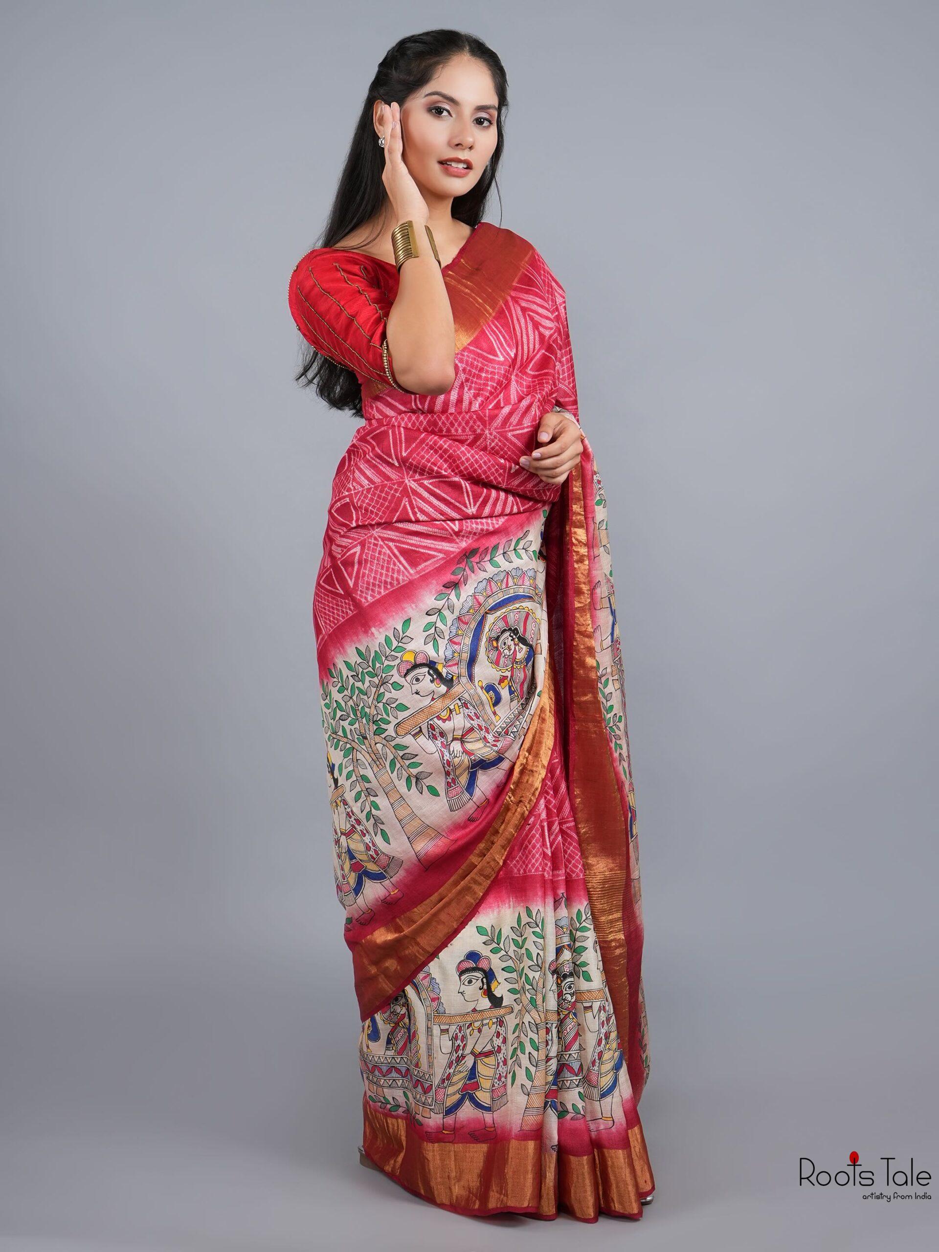 Add effortless charm to your everyday wardrobe with our Red Madhubani Shibori Silk Saree , crafted from premium-quality cotton. Part of our Mithila collection, this saree beautifully showcases traditional Madhubani artistry with delicate floral motifs, blending cultural heritage with a fresh, modern appeal.