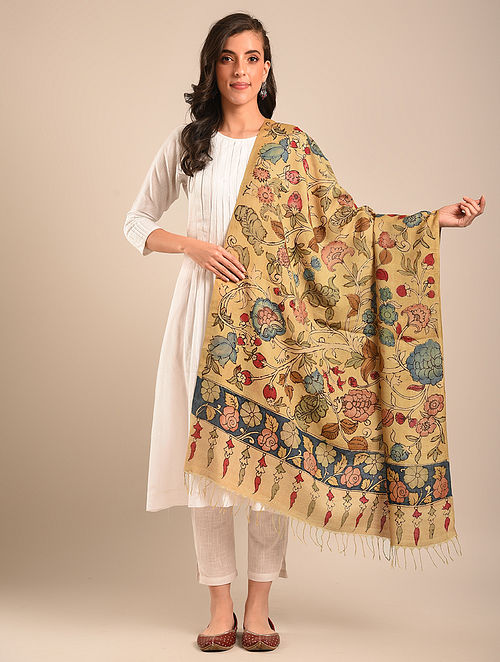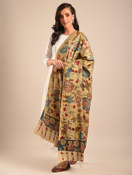 Drape yourself in heritage with this elegant Cotton-Silk Dupatta, a fine blend of tradition and artistry. Woven in Maharashtra with the soft sheen of cotton silk, the piece is adorned with intricate Kalamkari art from Andhra Pradesh, created using natural colors derived from plants and minerals.